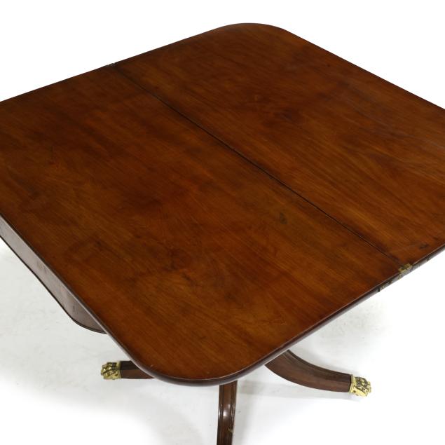 Circa 1820s, mahogany with line inlay, the flip top swivels to reveal a hidden compartment for storage of gaming chips and accessories, turned standard with quadruped base and brass paw feet, on casters.