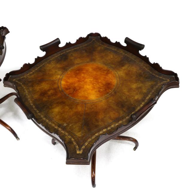 20th century, mahogany, the shaped tops with tooled leather surface in the Italian style and featuring an ornate gallery edge, raised on a hexagonal standard with reeded urn support and four scrolled legs on brass casters.