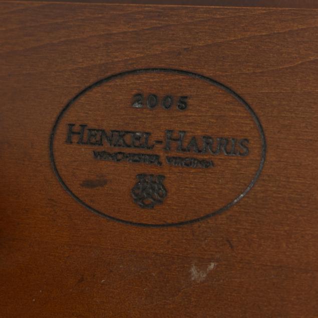 Contemporary, rectangular top with banded inlay and reeded edge, rounded corners, with two leaves, triple column supports on tripod base with down-swept legs on brass paw feet, labeled.