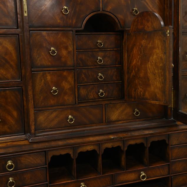 Contemporary, mahogany, mahogany veneer, two part form, upper case with bonnet top and carved central finial and turned finials, hinged tombstone glazed door with well developed interior featuring pigeon holes, (23) fitted drawers, mirrored prospect door with four interior fitted drawers, the base with a hinged slant front lid having loper supports, interior with embossed leather writing surface ten fitted drawers and pigeon holes, the case with four graduated cock beaded drawers, ogee bracket foot base, labeled.