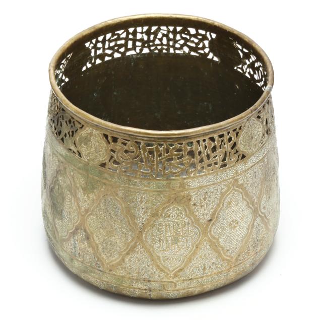 Persia, early 20th century, bowl form with reticulated shoulder, dovetailed construction, the whole decorated in calligraphic Arabic script, featuring (12) lozenge medallions, meandering arabesques, and six-petaled rosettes.