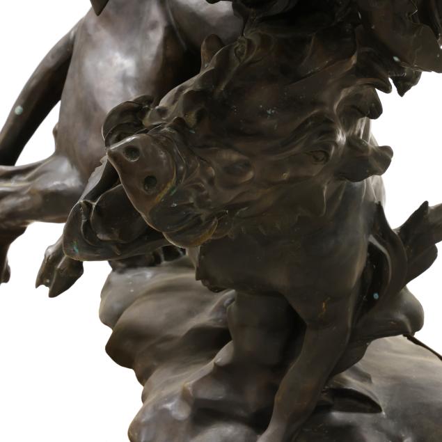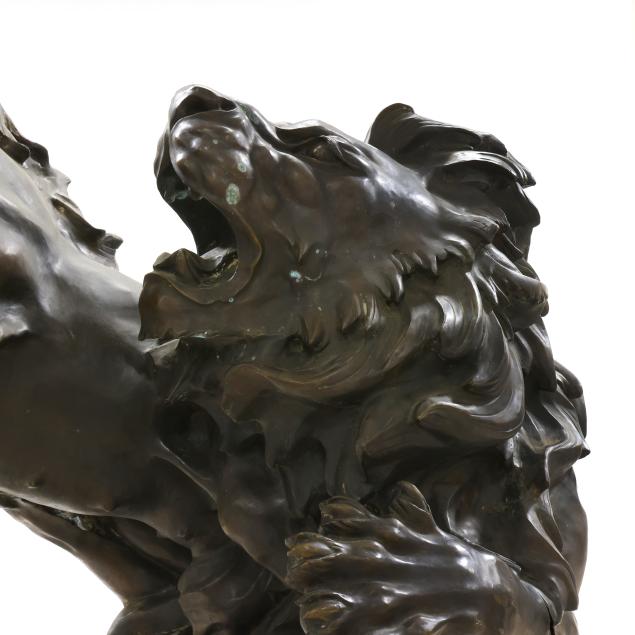 Late 20th century, patinated bronze, unsigned, a dynamic naturalistic casting of a male lion attacking two boars, inspired by the animalier bronze works of Antoine-Louis Barye (French, 1795-1875).