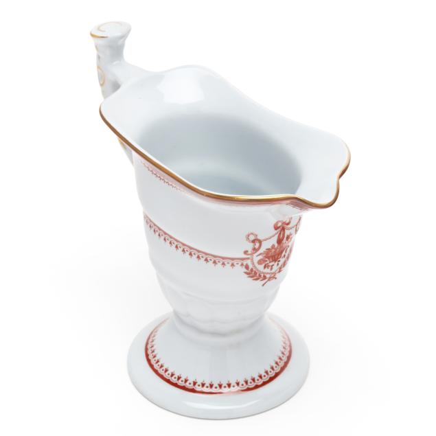 Second half 20th century, (52) pieces, each decorated with red bands, scalloped patterns, flower basket, and gilt rim, to include: (12) canton shape footed cups; (12) footed demitasse cups with (12) saucers (4 7/8 in.); (12) fruit bowls (5 in.); one creamer (HOA 5 1/4 in.); one sugar pot with lid (HOA 4 3/4 in.); one teapot with lid (5 1/2 in.); and one coffee pot with lid (8 5/8 in.); all marked "Spode Copeland England Fine Stone" and pattern name to underside, most additionally marked "Y3360."