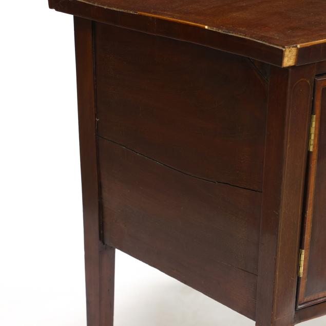 Early 19th century, mahogany veneer, oak and pine secondary, top with light wood line inlay and vertical banded veneer edge, single central drawer above arched return with corner fan inlays, flanked to the right by a deep drawer and the left by a hinged cabinet door, all with banded and string inlays, raised on six square tapered legs with stylized spade foot.
