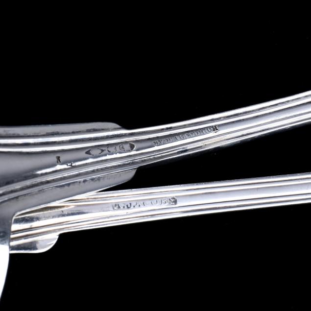 (12) pieces to include, a tablespoon with mark of Thomas Fletcher, Philadelphia, circa 1813-1830, period monogram (9 in.); a waffle server with mark of Samuel T. Crosby, Boston, circ 1850, with engraved blade and stylized monogram (8 1/4 in.); a pair of shell form master salt spoons by J & W. Moir, New York; a knife with engraved blade by Bailey, Kettell & Chapman, Boston; a pair of knives with mark of John and James Cox, New York; a large knife and cheese scroop with mark of Albert Coles, the knife engraved "J. Clement" (11 in.); a shell sugar spoon with mark of Crosby & Brown, Boston, monogrammed; a cream ladle with mark of Abel Jacobs, Philadelphia, circa 1820; and a gravy ladle with rubbed hallmark and retail mark of Hyde & Goodrich, New Orleans.