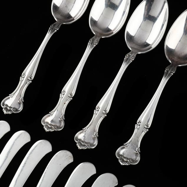 (16) pieces, to include: (4) Gorham Cromwell dessert spoons (7 1/4 in.); (12) engraved butter spreaders with worn marks, likely A F Towle & Son (5 3/8 in.).