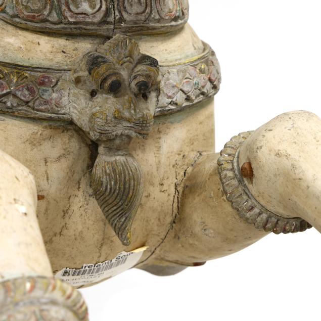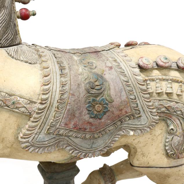 19th century, carved teakwood with pigments, horses are crafted with front legs raised, mask head with tassel at front of reigns, floral patterns and medallions to saddle and reigns, raised knobs to mane and back of saddle, open mouths with teeth and tongue showing, a curling fancy feather is featured between the alert ears at top of each head, each horse is raised on a shaped wood pole set into a square base that may originally have had wheels.