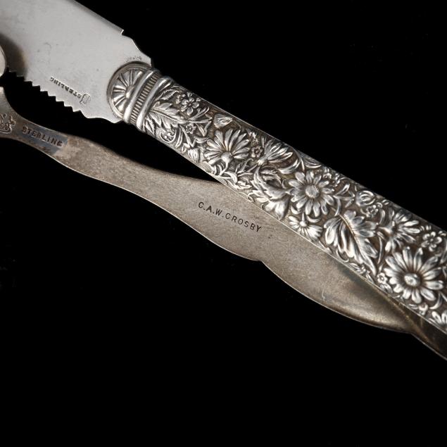 St. Cloud place spoon; a repousse meat fork by Jacobi & Jenkins; a repousse fruit for by Hamilton & Deislinger; a Reed & Barton