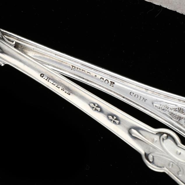 Circa 1850s to 1870s, (15) pieces, includes (3) pieces in a uniform pattern engraved "1870" with period monograms, unmarked; a repousse spoon with gold wash bowl and twisted handle marked "Coin"; a fork with retail mark of "C.S. Rait"; (3) tablespoons with marks of G. H. Lewis, Rudd & Coe, and David I Burger; a sugar spoon and master butter spreader with mark of George Sharp, Philadelphia; a sugar spoon and place spoon with mark of Farrington & Hunnewell, Boston; a tablespoon with twisted handle and mark of Duhme & Co.; a tablespoon with mark of Hotchkiss & Schroeder; and a teaspoon with mark of F. A. Bunnell & Co. Syracuse; most with assorted monograms.