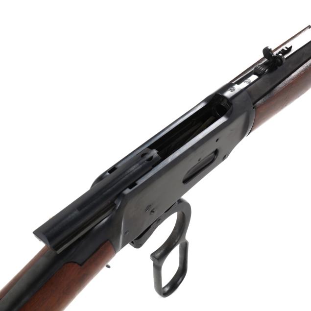 Serial number 2327118 present on the bottom of receiver, barrel markings read WINCHESTER - MODEL 94 - 30-30 - WIN WINCHESTER TRADEMARK MADE IN U.S.A. WINCHESTER PROOF STEEL, round barrel with full length magazine tube, ramped front sight and adjustable rear, straight grain walnut stock, checkered metal buttplate.