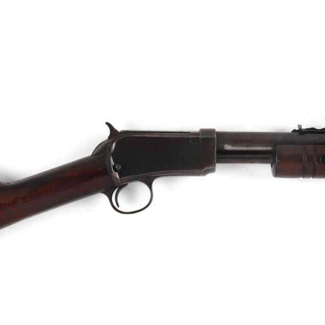 Serial number 201580 present on belly of action and trigger guard tang, barrel stampings read WINCHESTER TRADEMARK MODEL 62 / MADE IN NEW HAVEN CONNN U.S. OF AMERICA / .22 S L OR L.R., 23 in. round blued steel barrel, fixed front dovetail sight, rear sight adjustable for windage and elevation, blued action, walnut stock with walnut cob forend, hard rubber Winchester branded buttplate.