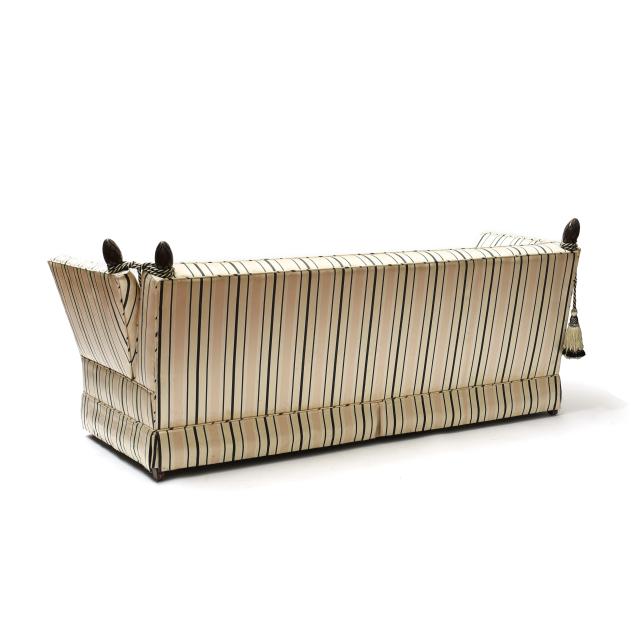 Late 20th century, four carved pineapple finials, stationary arm sides with tassel support, slip cushion, draped skirt over square tapered feet, together with two bolster pillows and two throw pillows.