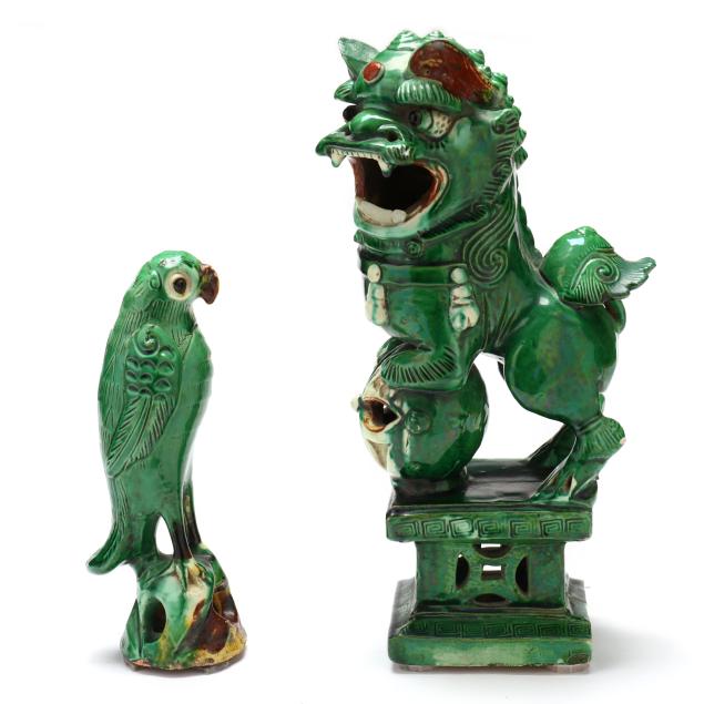 Late 19th century, both having predominately green glaze; includes a male foo lion over a reticulated pedestal base (14 x 4 x 7 in.); and a parrot atop a naturalistic base (9 1/2 in.); neither marked.