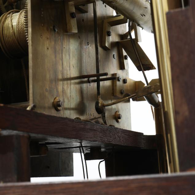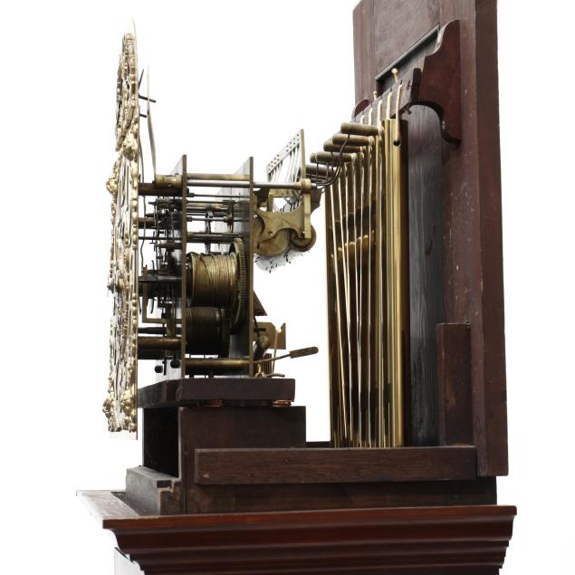 Early 20th century, the brass face with second hand and Whittington/Westminster chime, cherub spandrels, the hood with broken arched pediment and central finial, fluted column supports, the waist hinged door with beveled glass revealing pendulum, three weights and nine graduated tubes, glass paneled sides, raised panel base, bracket feet.