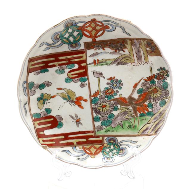 Meiji period (1868-1912), includes (3) in a similar palette with alternating registers and a foliate center; and a pair of (2) with polychrome and gilt crane decoration; all with scalloped rims, all unmarked.