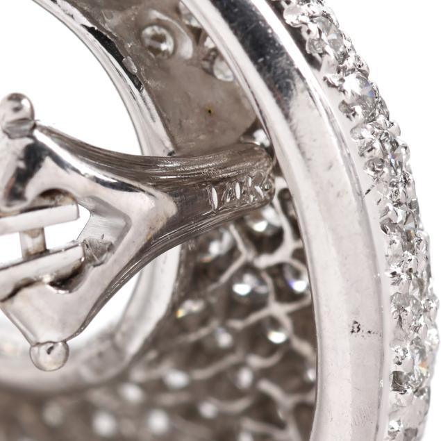 Designed in a tapered swirl motif and fully set with full cut round diamonds weighing approximately 6.00 total carats (H-I color, SI2-I1 clarity), completed with posts and omega clip backs, stamped 14K.