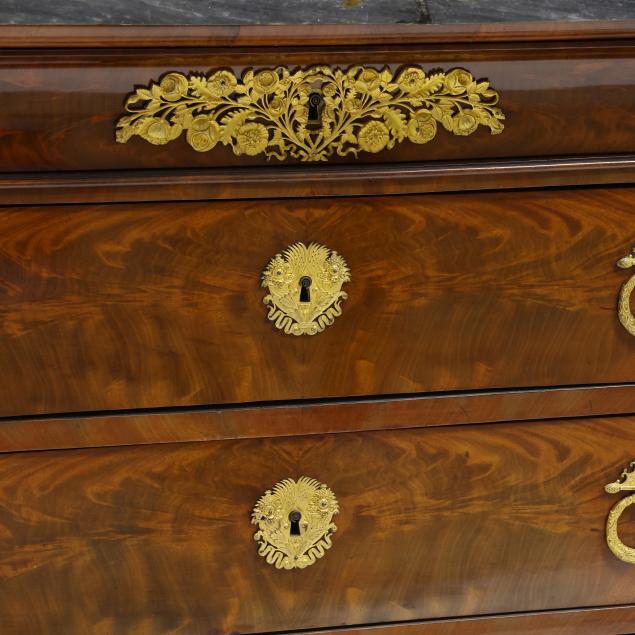 Circa 1830, mahogany veneer, oak secondary, rectangular marble top, upper concave frieze drawer over three flush drawers, molded base with short shaped panel feet.