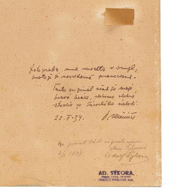 Watercolor and acrylic on paper, 1933, signed and dated at lower right, inscribed en verso, with stamp of Adolf Sykora, Hradec Králové to verso, presented in a giltwood frame below glass.
