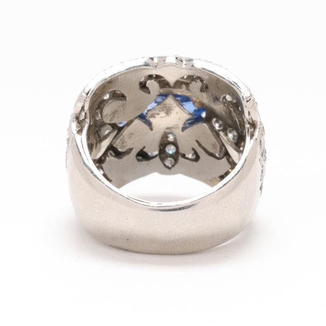 the wide platinum band prong set to the center with an oval cut sapphire (8.74 x 6.09 x 4.01 mm) weighing 1.91 carats (actual), set within rays of bead set full cut round diamonds weighing approximately 2.10 total carats (H-I color, SI2-I1 clarity), on tapering shank, testing platinum.
