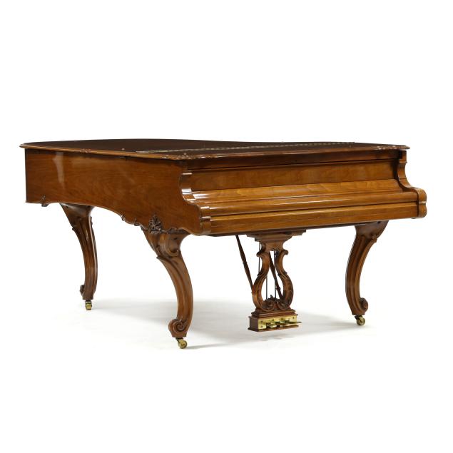 Circa 1929, signed Steinway & Sons, serial number 265596, interior casting marked "REPETITION ACTION PAT. / CAPO D. ASTRO PAT. DUPLEX SCALE PAT." and "STEINWAY FOUNDRY CASTING / TUBULAR METALLIC ACTION FRAME PAT.", Louis XV style case in American walnut veneers, set atop Rococo style carved cabriole legs with conforming three pedal lyre, brass casters, without artist's bench.