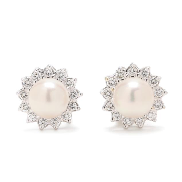 Centered on a round cultured pearl (9mm) within a halo of full cut round diamonds weighing approximately .78 total carat (H-I color, VS2-SI1 clarity), completed with posts and omega clip backs, stamped 18K and with maker's mark ANF.