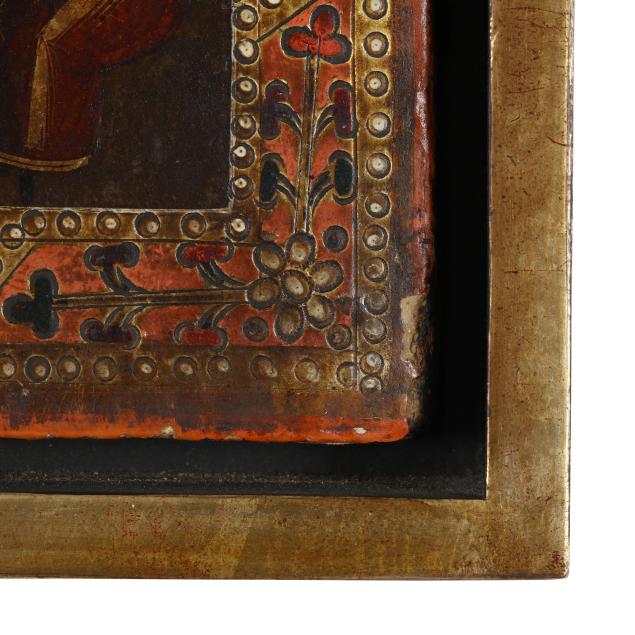 Russia or Eastern Europe, 19th century, tempera and gilt on gesso prepared wood panel, the verso incised with script, presented in a contemporary gilt floater frame.