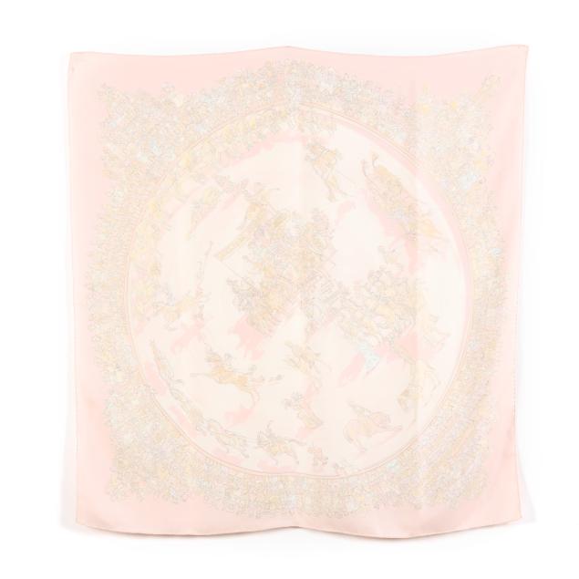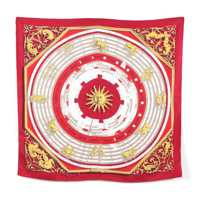 To include: Astrologie by artist Françoise Faconnet, the silk twill with rolled and hand-stitched edges and with a color palette of red, maroon, and gold (34 x 35 in.) (small stain spot to one end); and Cirque Molier by artist Philippe Dumas, the silk twill with rolled and hand-stitched edges and with a color palette of pink and yellow (33.5 x 35 in.) (small stain spot to one end).