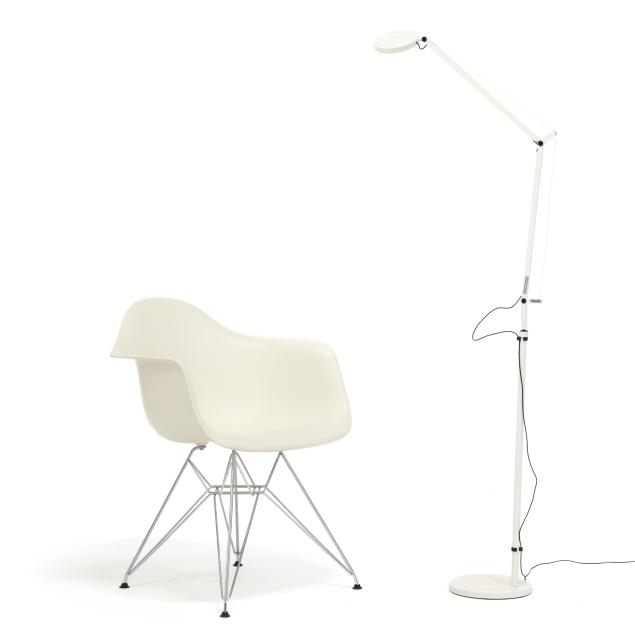 Designed by Naoto Fukasawa, versatile powder coated metal with cable adjustments, can be mounted as a floor lamp (as shown) or mounted as a desk-top lamp, labeled and with instructional pamphlet; together with a contemporary production Charles and Ray Eames white plastic shell armchair on steel frame, marked Herman Miller.