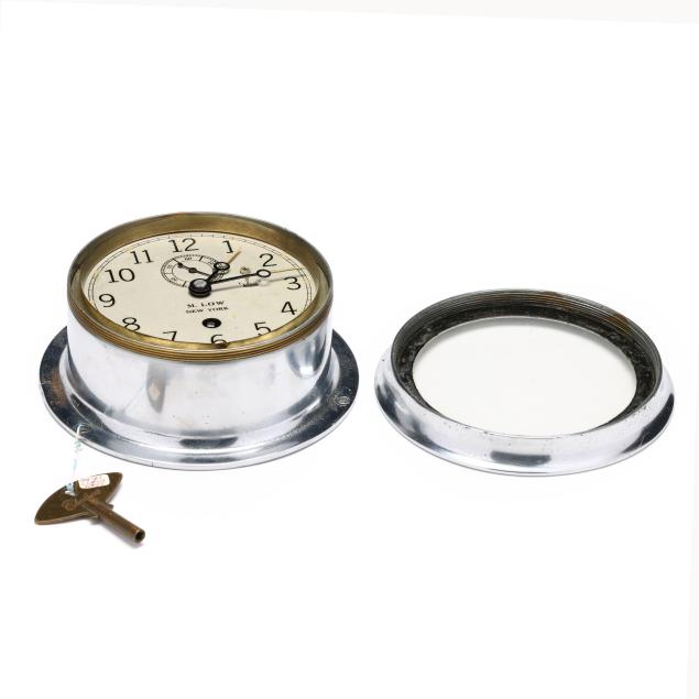 First half of 20th century, the brushed steal dial marked with the retailer, serial number 122943, in a silver-toned and glass case, marked, retaining winding key.