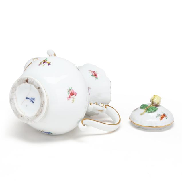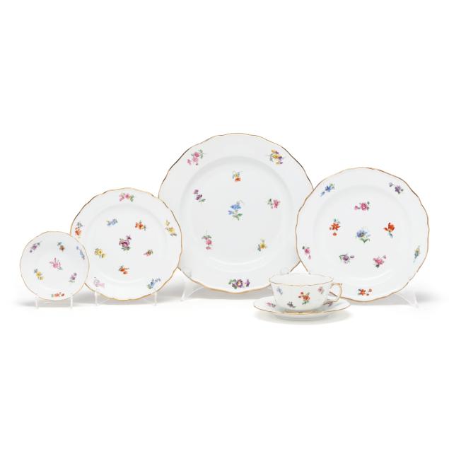 Scattered Flowers, including: (16) flat cups with (11) saucers; (5) demitasse cups; (2) saucers (5 7/8 in.); (11) dinner plates (10 in.); (10) salad plates (8 3/8 in.); (13) bread & butter plates (7 in.); one coffee pot with lid (7 1/2 in.); one mini open sugar bowl; and (2) small bowls. Also included in the lot are (14) pieces in very similar floral patterns: (4) small bowls (4 3/8 in.); (6) bread & butter plates with gilt scrolls at rim (7 3/8 in.); (3) bread & butter plates (7 in.); and one small vegetable dish (6 in.). All with various underglaze crossed sword marks, and most with impressed marks and hand-painted numbers.