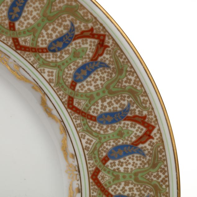 France, (75) pieces, each with attractive gilt diapered border with red, green and blue arabesque motif, including: (9) dinner plates (9 3/4 in. diameter); (8) luncheon plates (8 5/8 in. diameter); (10) bread plates; (9) bouillon soup cups; (10) fruit bowls; (4) teacups and (9) saucers; (2) demitasse cups and (11) saucers; (2) oval vegetable bowls; and a square serving bowl; marked.