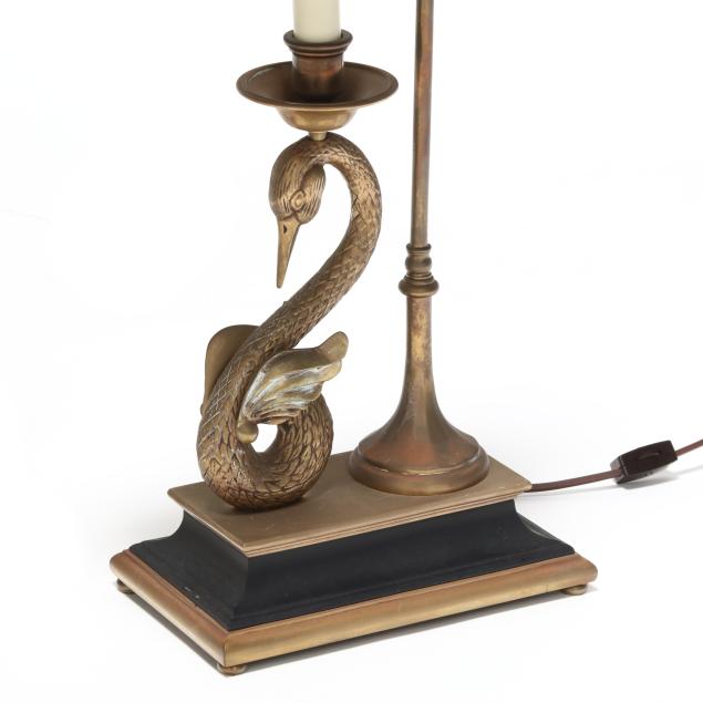 1982, each a brass swan form resting on a base, with raised candlestick socket and adjustable tole shade; labeled to underside.