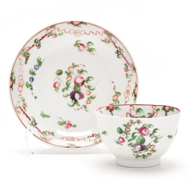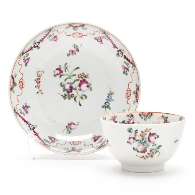 Mid to late 18th century, includes a larger scalloped rim tea bowl cup with matching saucer (cup 2 1/4 in.; saucer 6 1/4 in. diameter )(both cups with hairlines, one with nick to foot; both with nicks to foot rim)