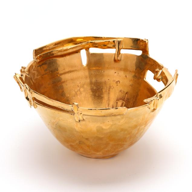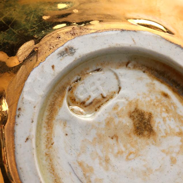 Wheel turned and hand-built porcelain with all over luster glaze, of round form having a pierced and geometric form rim, signed with "SBP" artist glyph to underside.
