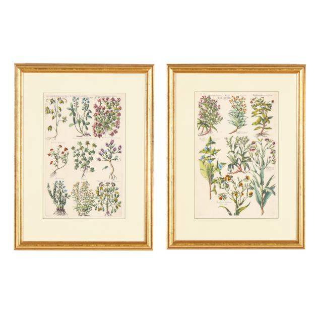 18th century, hand colored engravings, of various flowers with names indicated in Latin, includes Plates LXVIII and XXXIX; matted in uniform framing below glass.