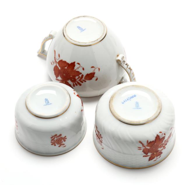 Hungary, hand-painted, (39) pieces to include: a single serve coffee pot (6 5/8 in.); a mini creamer jug #1644 (3 in.); a small round creamer #648 (5 1/2 in.); a handled sugar bowl with lid #665; a sugar bowl with lid #6128 (3 1/2 in.); a small bowl with lid (3 1/8 in.); a sugar shaker with lid #259 (5 in.); salt & pepper shakers #260; (12) bread & butter plates; and (9) cups and (10) saucers #1726; all marked.