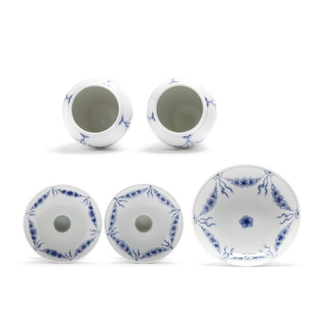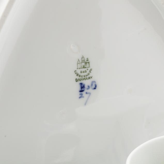 Denmark, 20th century, blue floral garlands surround a central flower head, some with a pierced edge, (42) pieces to include: (7) dessert/pie plates #618.6 (7 5/8 in.); (1) dessert/pie plate #27 (7 1/2 in.); (6) cups #305 with (6) saucers #305.6; (4) side plates #306.6 (6 1/4 in.); a handled cake plate #101 (10 1/2 in.); a dinner plate #624.6 (10 1/4 in.); a deep plate #323.6 (8 3/8 in.); a small oval dish (7 1/8 in.); a small square dish #194 (4 3/8 in.); (2) large oval dishes (9 in.; 9 7/8 in.); a triangular cake dish; a rectangular sandwich tray #96 (10 in.); a coffee pot with cover #91A; a footed candy dish #222 (6 in.); a pair of vases (5 in.); a pair of candleholders #224; (2) cream jugs #189; and a covered sugar bowl #94; all marked.