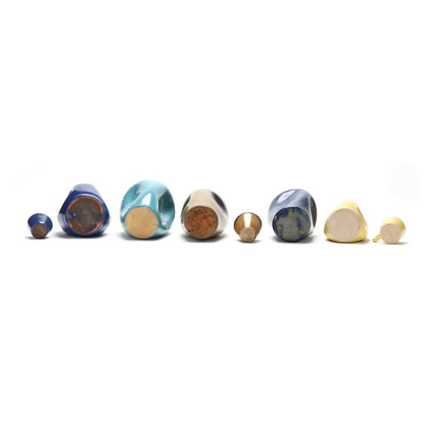 20th century, glazed earthenware, (14) pieces including a yellow glazed form signed and dated "81" by Fred Beane of Old House Pottery, Seagrove, North Carolina with conforming cup (8 3/4 in.); a single with deep Albany slip glaze, signed "PENLAND'S POTTERY CANDLER N.C." (7 in.), four others of similar form and glaze, one stamped "Moonlight School Exchange Asheville NC" and with conforming cup (6 1/2 in.); (2) taller forms in a blue glaze, attributed to A.R. Cole, unsigned (10 1/2 in.); one in salt blue glaze (9 1/4 in.); and the tallest with blue glazed accents, with conforming cup, attributed to Hilton Pottery, Newton, North Carolina (11 1/4 in.). Also included is a small example in orange with black hatch decoration, signed by Greg Schooner of Ohio.