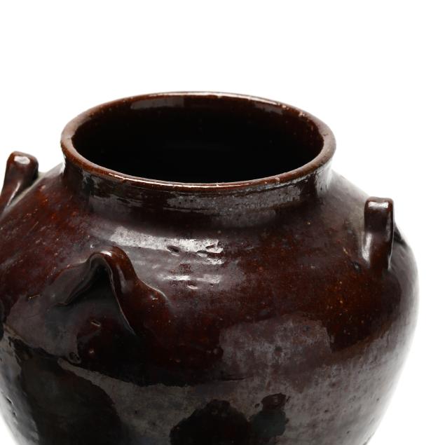 Including a small bowl, inkwell, and vase in Chinese Blue glaze (5 1/2 in. tallest), a dark glazed coin bank in hive form (6 in.), a dark glazed jar form vase with four shoulder handles (6 1/2 in.), a bulbous salt glazed vessel with applied dogwood medallions and linear sgraffito motif to the shoulder (7 in.), and double gourd form vase and low vase with green glazes (7 in. taller) All with company stamp to the underside.