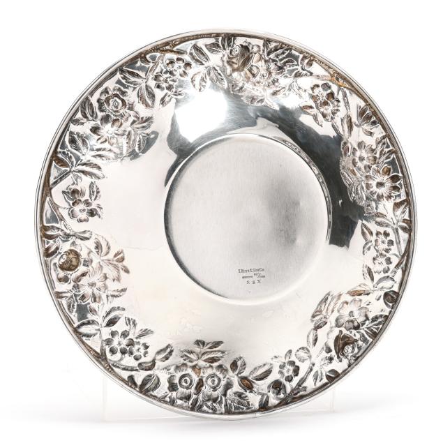 Period mark circa 1896 to 1924, pattern number 15X, featuring a wavy hand chased repousse rim with foliate sprays along tree branches, script monogram to the well.