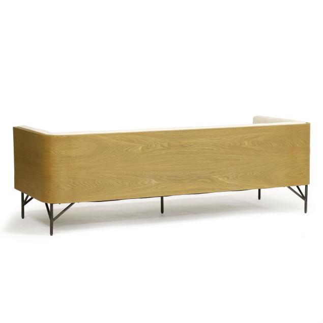 Oak veneered case with curved corners, cream boucle type upholstery, stationary single seat cushion, black painted metal legs, labeled.