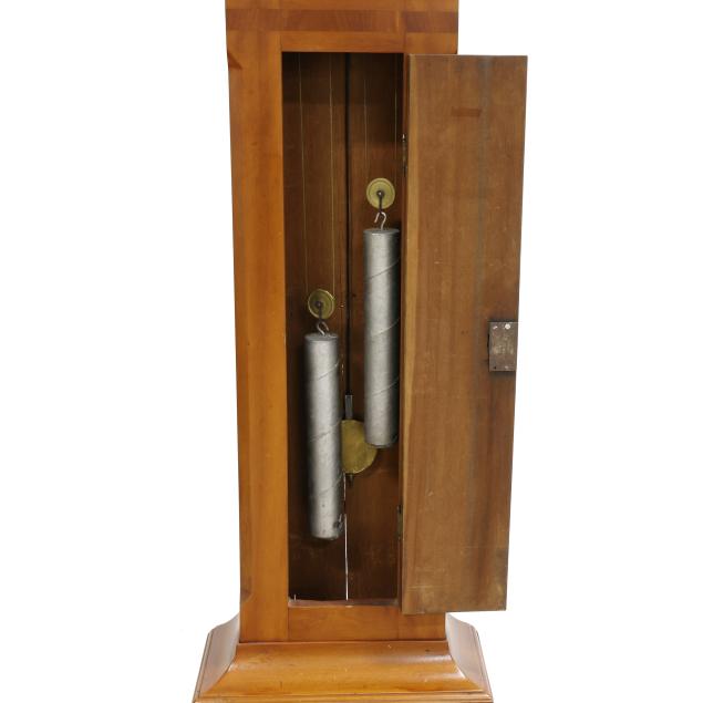 Circa 1800, painted metal face with calendar dial and bell strike, the hood with broken arched pediment and three turned wood finials, hinged glazed tombstone door flanked by fully turned columns, the case with hinged banded inlaid waist door with cock beaded edge, canted corners with upper banded inlay, paneled base on turned feet, with two weight, pendulum and case key.