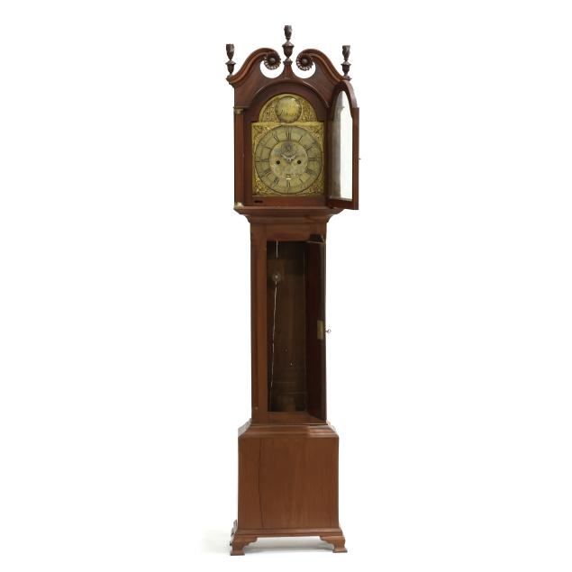 18th century, engraved brass face marked "Robt Knox, Paisley", with second dial and calendar dial, broken arched pediment with carved floral rosettes, three flame finials, glazed tombstone door flanked by fluted half columns with brass caps, shaped and molded edge waist door with fluted quarter columns, ogee bracket feet, with case key and pendulum.