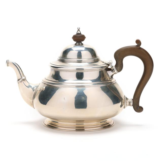 Birmingham (1921), partially rubbed maker's mark, numbered and marked "Made in England / for / James Robinson" to the underside, featuring a scrolled wood handle and uniform urn finial, faceted spout, without a monogram.