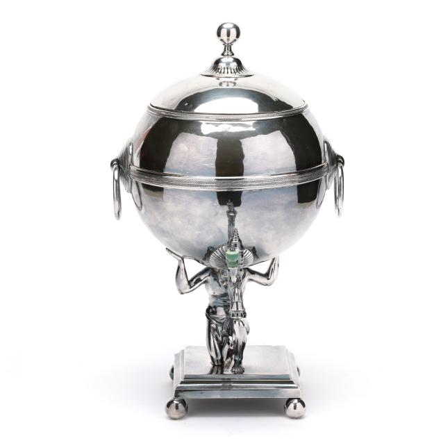 Silverplate over copper, unmarked, featuring a cast atlas figure supporting a double-handled sphere with spout, interior retaining lidded fire brick compartment, set atop a square terrace, raised on ball feet, not monogrammed.