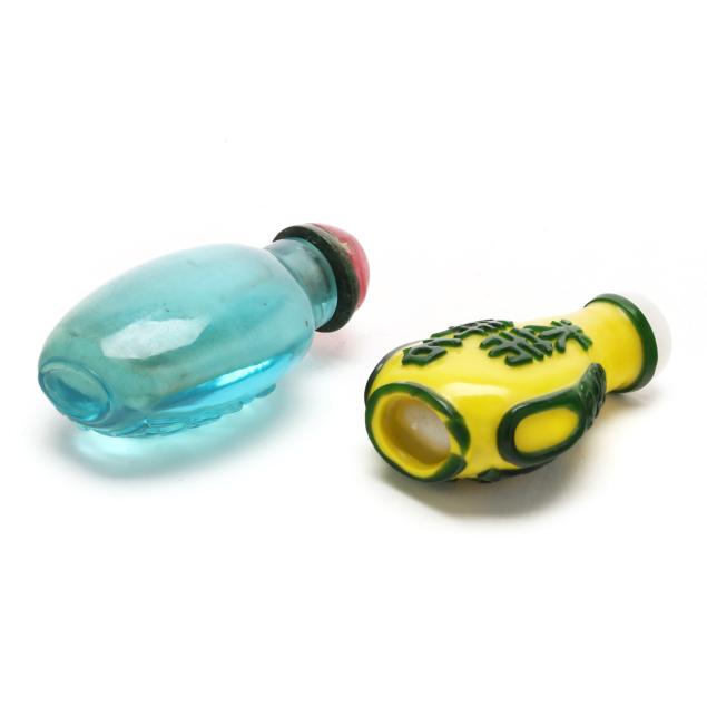 Includes a clear glass snuff bottle with yellow overlay carved with fish and lotus, a light turquoise blue glass snuff bottle with yellow overlay carved with birds and flowers, a clear glass snuff bottle with cobalt blue overlay carved with squirrels and grapevines, a yellow glass snuff bottle with green overlay carved with figure by scholar's rock to one side and calligraphy inscription to other, and a class turquoise glass bottle with horses carved in low relief, each of the snuff bottles has a spoon, stopper, and cover.