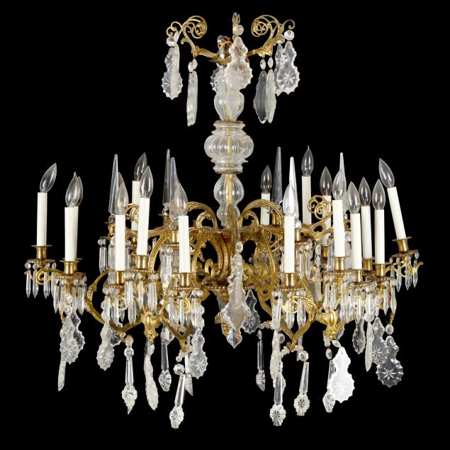 First half of 20th century, a twenty-one light form, with six additional bobeches wielding obelisk prisms, featuring allover scrolled foliate rococo style decoration, a central pressed glass baluster, terminating in a foliate bouquet finial, with cut and leader crystal drop prisms, electrified, presented with foliate ceiling mount, not marked.