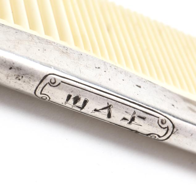 All with directorship mark of John C. Moore II (1907-1947), including a handled oval hair brush, pattern number 6688 / order number 1931 (9 in.); handled oval mirror, 5167/2196 (10 3/8 in.); a clothes brush 3343/3521 (6 1/8 in.) vanity jar, 16740/501 (3 x 4 1/2 in.); nail buffer 17741/7578 (5 in.); nail file, 18108/27533 (6 1/2 in.); and comb, 8278/9052 (8 1/4 in.). Each with matching "EAH" monogram.