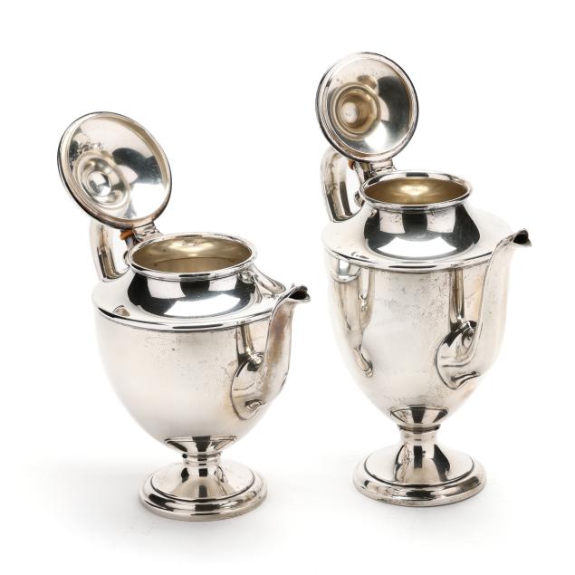From the Collection of Philena Jenkins, Richmond, Virginia Some scattered light scratches; creamer with dent to foot rim; a few small dents to coffee pot body; teapot with dent to foot rim and small dents to body.