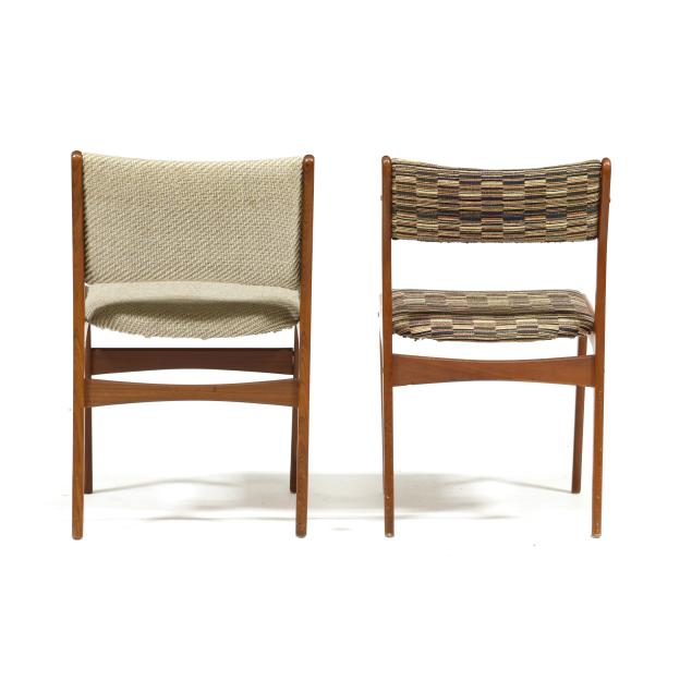 Circa 1980, including a rectangular dining table with two draw leaves, rounded canted legs, labeled BRDR Furbo (29 x 35.5 x 57 in., each leaf 19.5 in.), four side chairs likely by Erick Buch or Benny Linden, red stamp "Made in Denmark" (31 x 19 x 18 in.); and two side chairs labeled Uldum Mobelfabrik (31 x 18.5 x 18 in.).